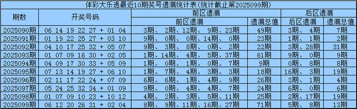 凡哥体彩大乐透第2025100期前区五区遗漏分析:(定义:遗漏0-3期号码为热码,遗漏4-9期号码为温码,遗漏10期及10期以上号码为冷码)